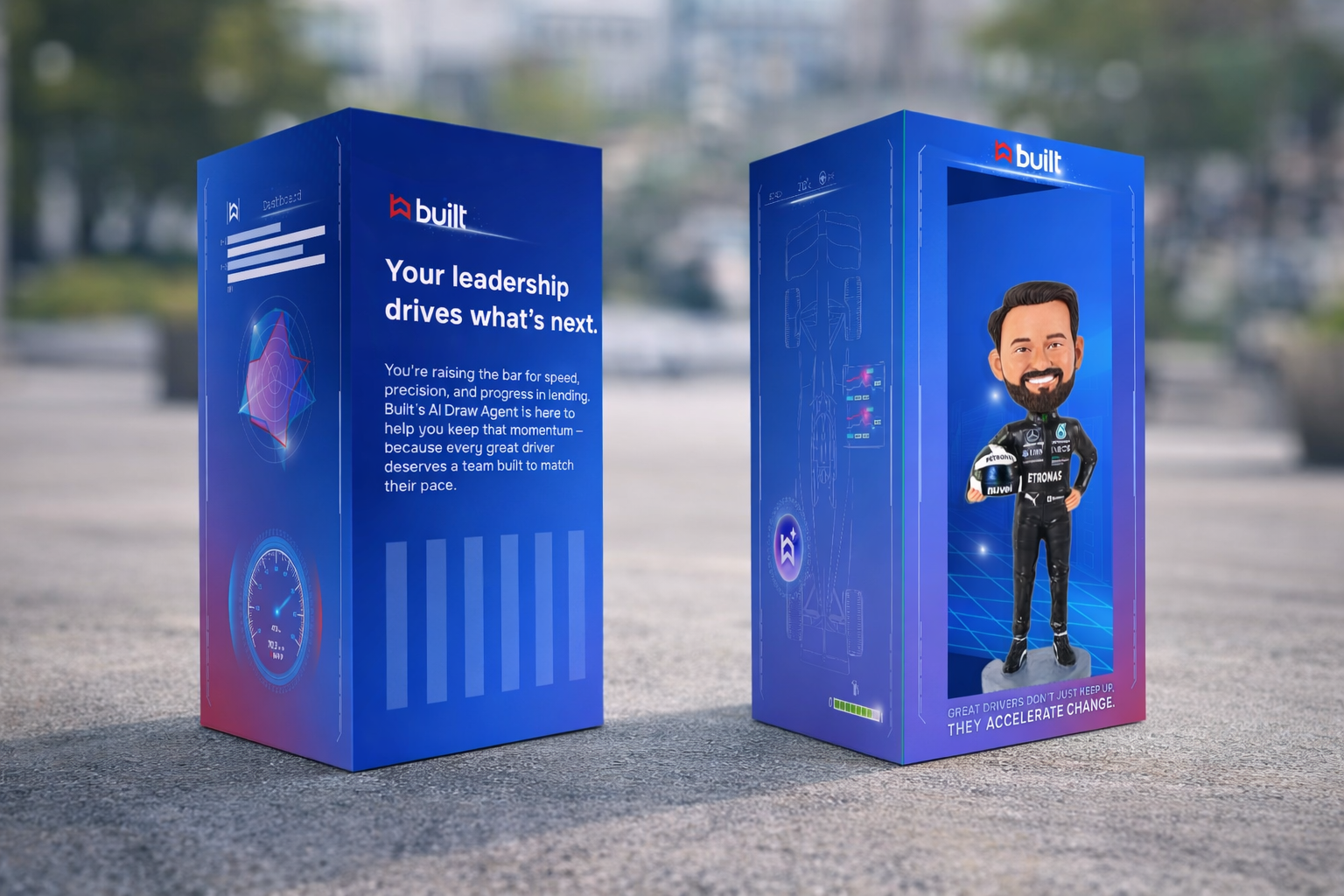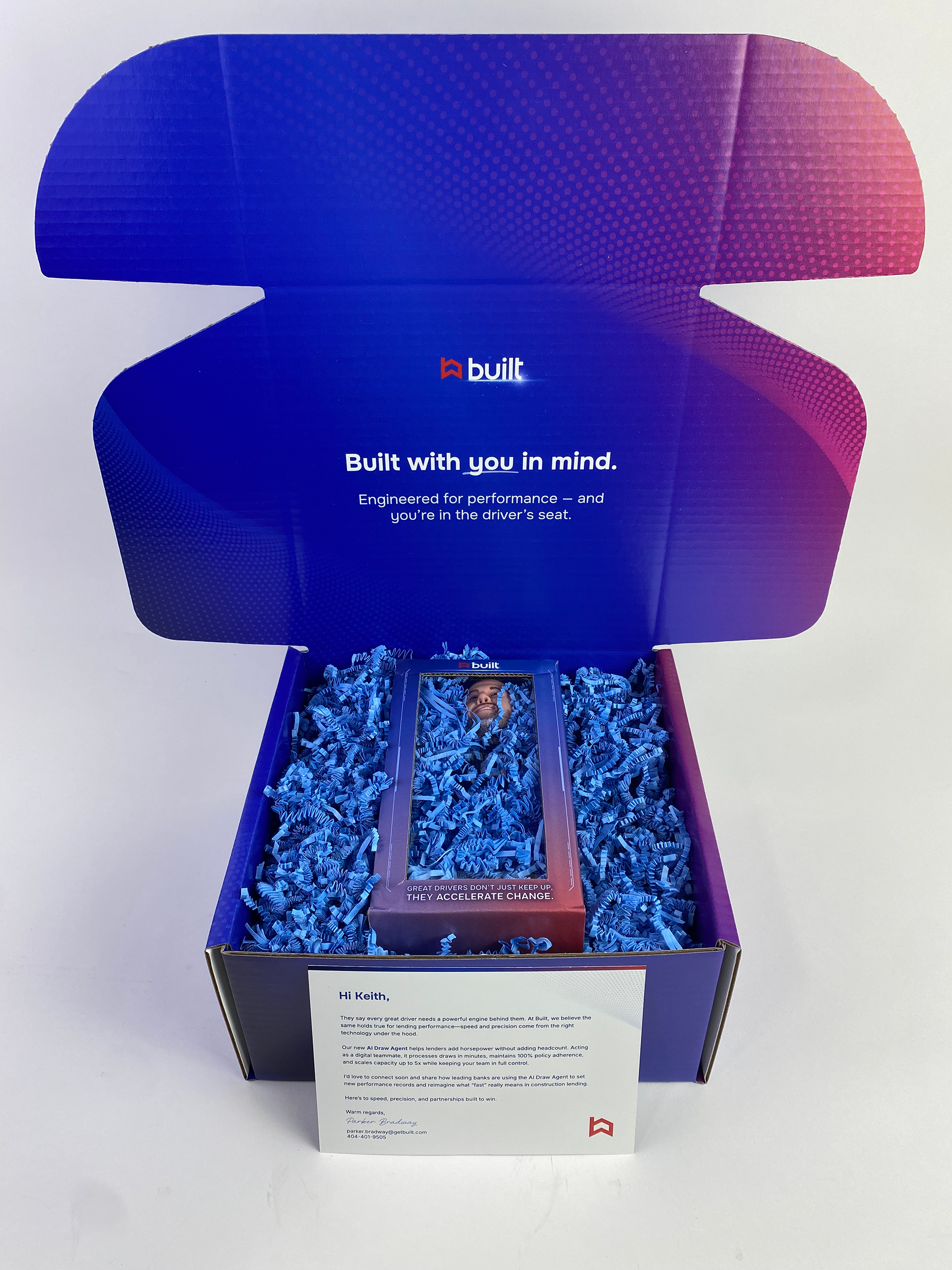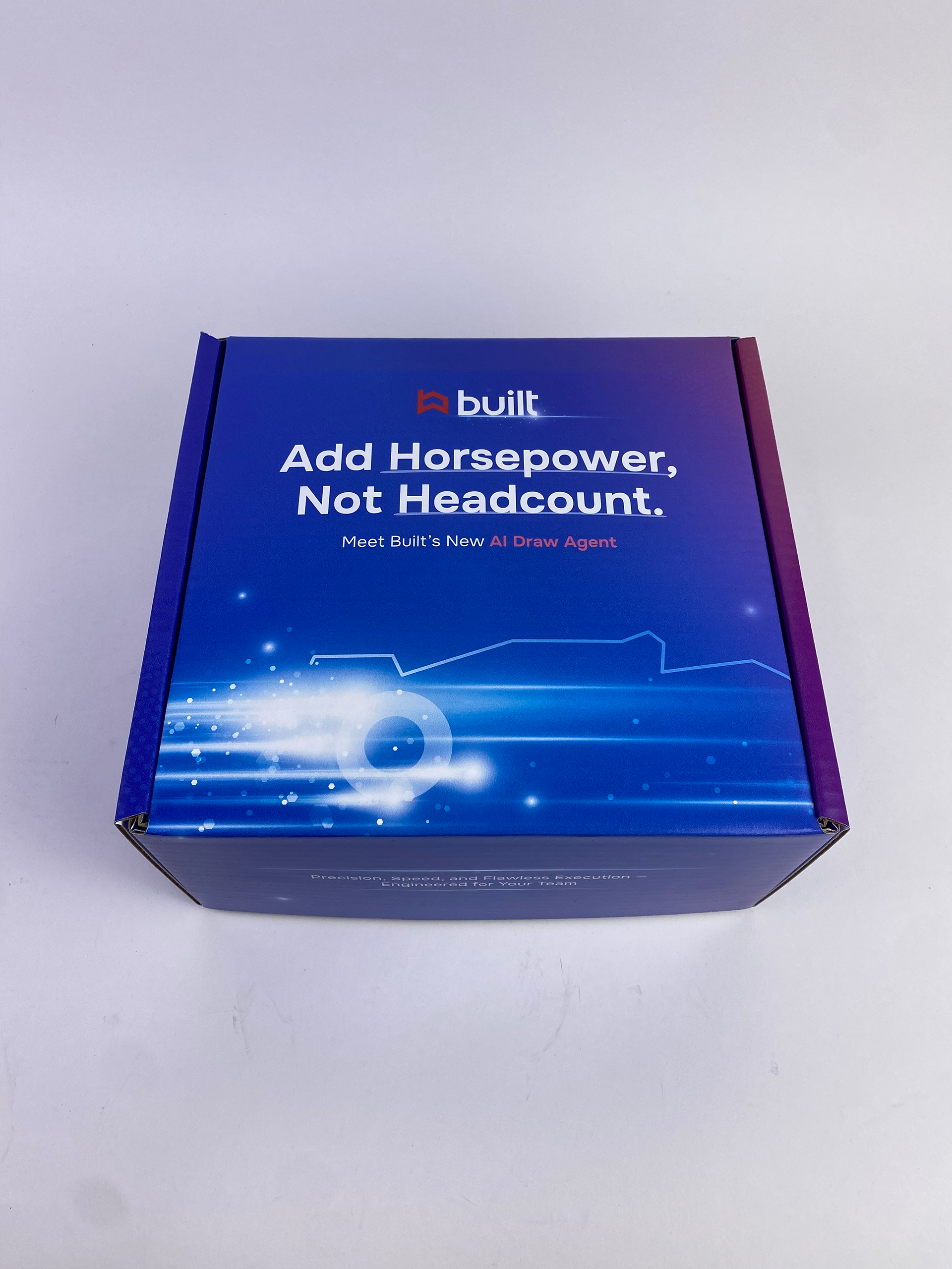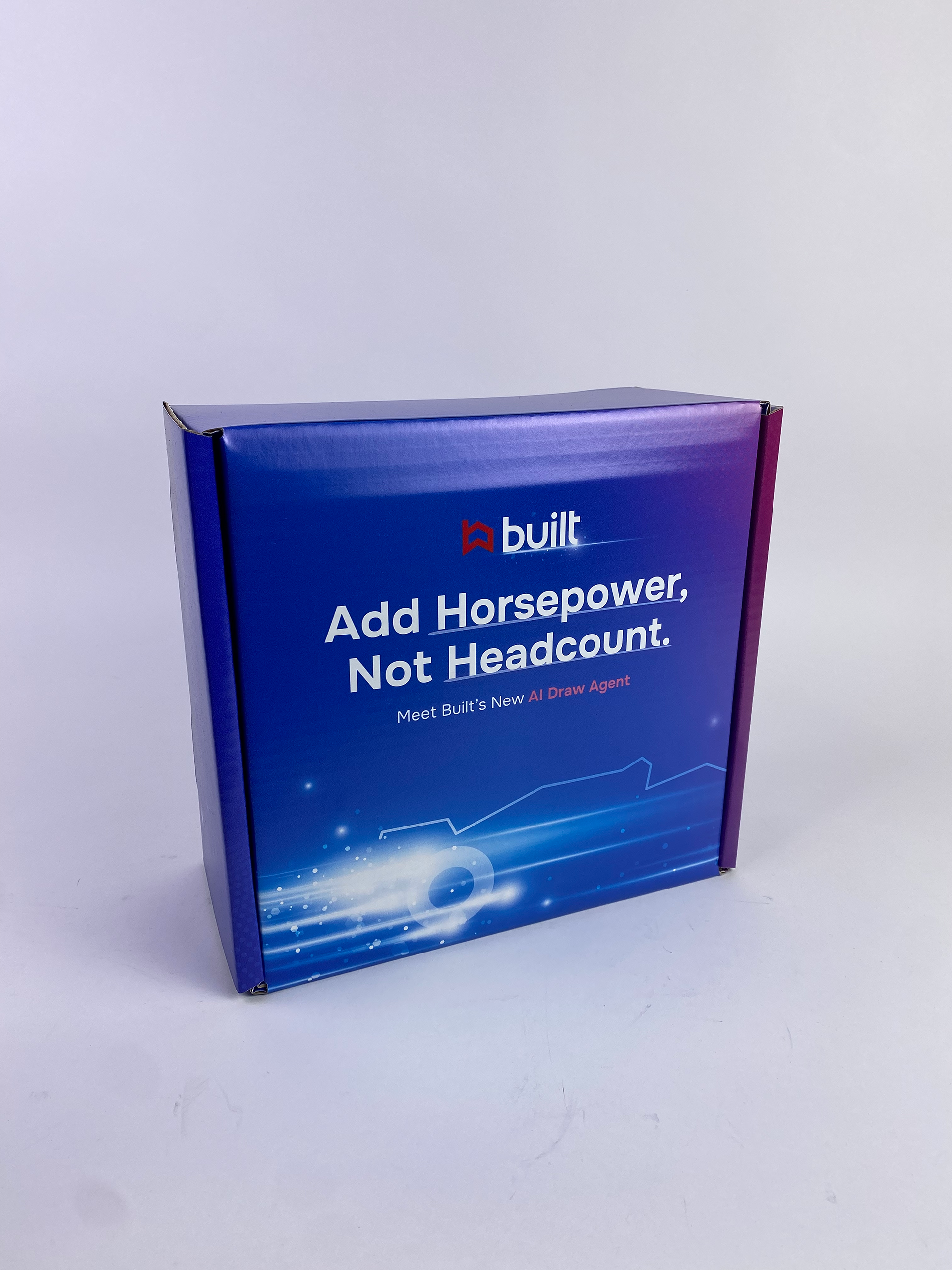The concept positioned the AI Draw Agent as a high-performing “team member,” reinforcing Built’s message of adding horsepower—not headcount. I developed the visual system for the campaign, designing a branded collector-style bobblehead box, a custom shipping box, and a fully branded unboxing experience that aligned with Built’s performance-driven identity.