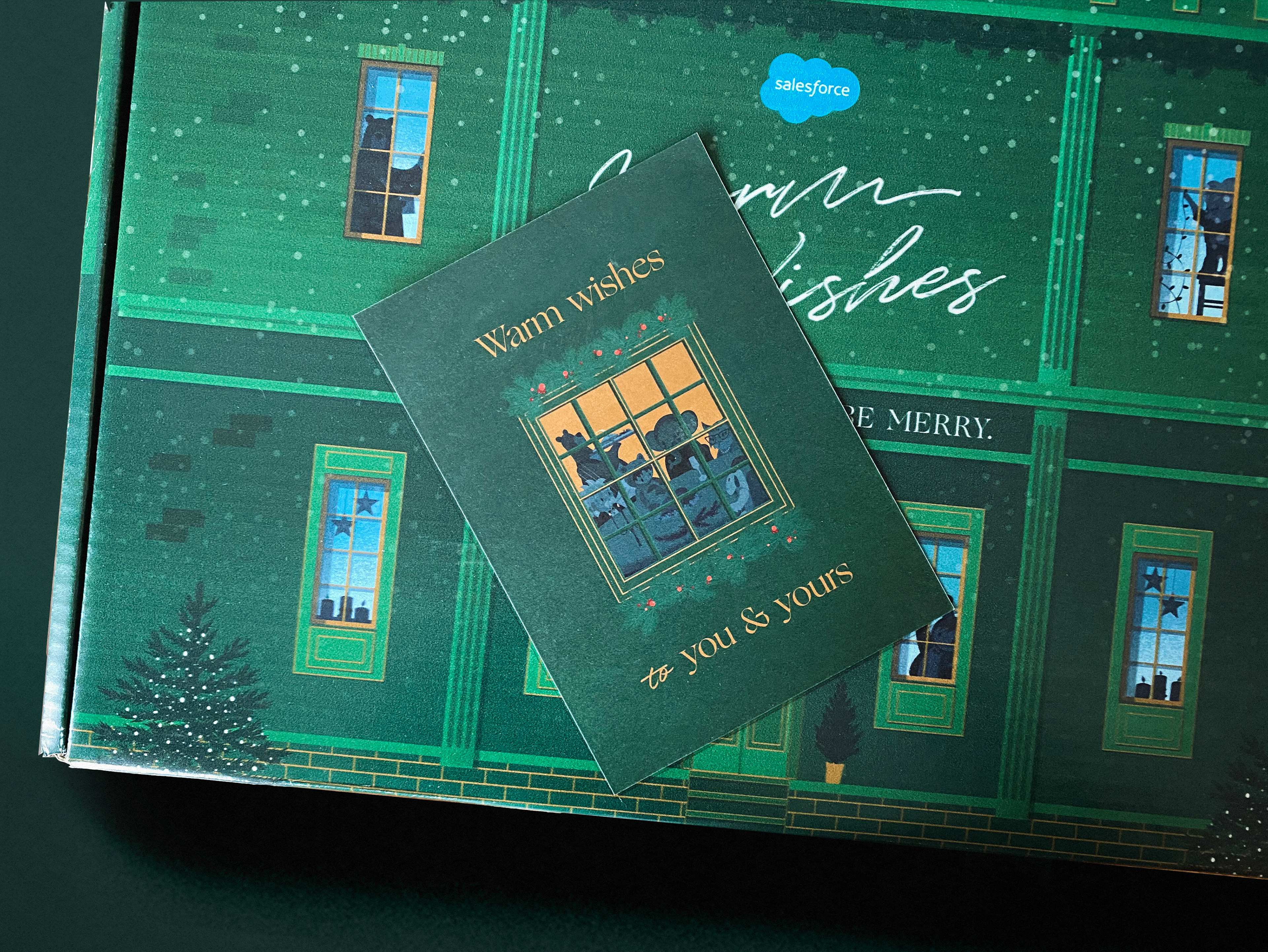The packaging design elevated the unboxing moment, blending luxury with seasonal comfort. Rich pine greens and gold accents added an elegant touch, while subtle Salesforce character illustrations peeking through windowpanes infused a sense of whimsy without overt branding.